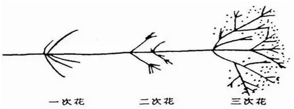随着碳含量的增加,在芒线上继续爆裂产生二次花、三次花不等。在芒线附近所呈现的明亮的小点称为花粉。